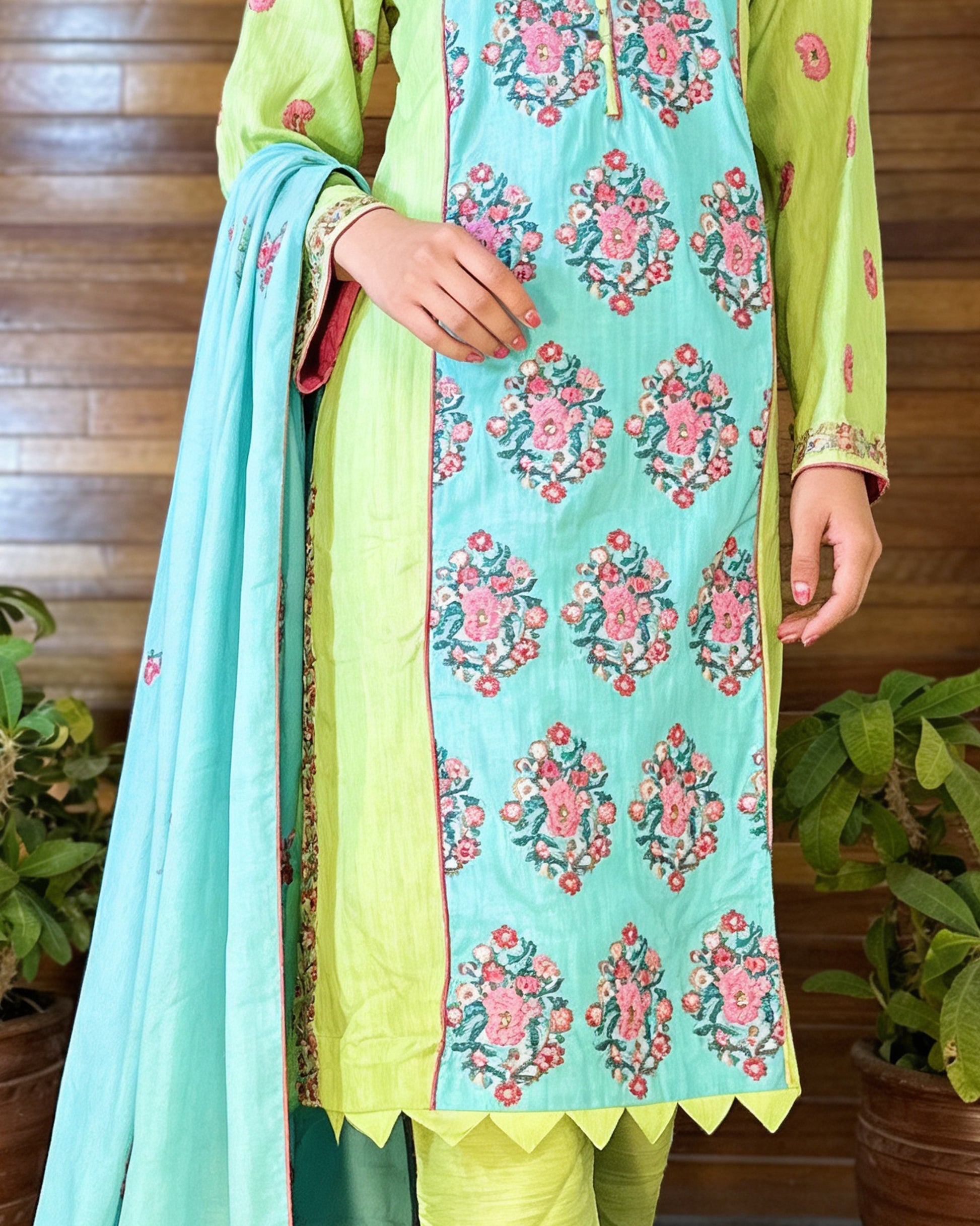 Elevate your wardrobe with this sophisticated 3-piece suit crafted from premium Khaddar fabric. The embroidered front and sleeves showcase intricate detailing, while the matching embroidered wool shawl adds a luxurious finishing touch. Featuring an embroidered Khaddar shirt paired with plain trousers, this readymade ensemble combines traditional craftsmanship with contemporary style.