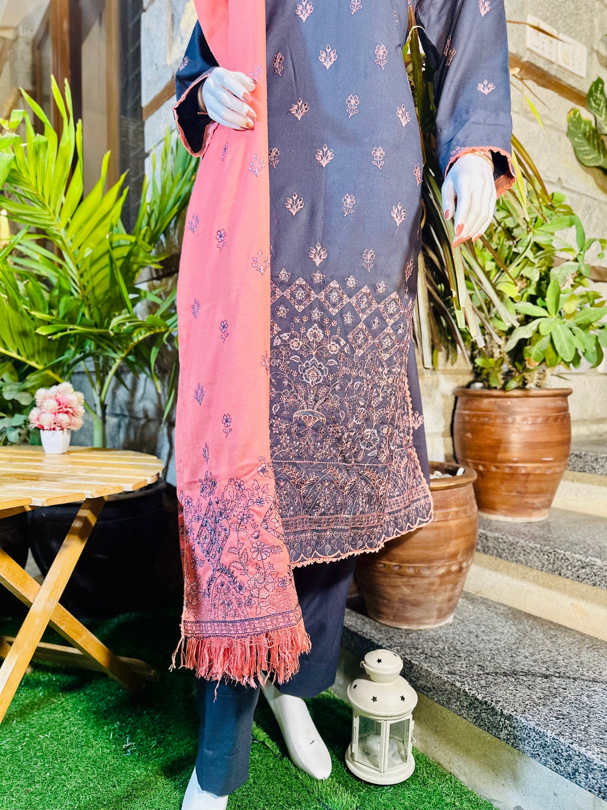 Step into elegance with this stunning 3-piece dhanak ensemble. The full heavy embroidery on the shirt and sleeves creates a refined look, beautifully complemented by an embroidered wool shawl and plain trousers with designed borders for a complete, polished appearance.