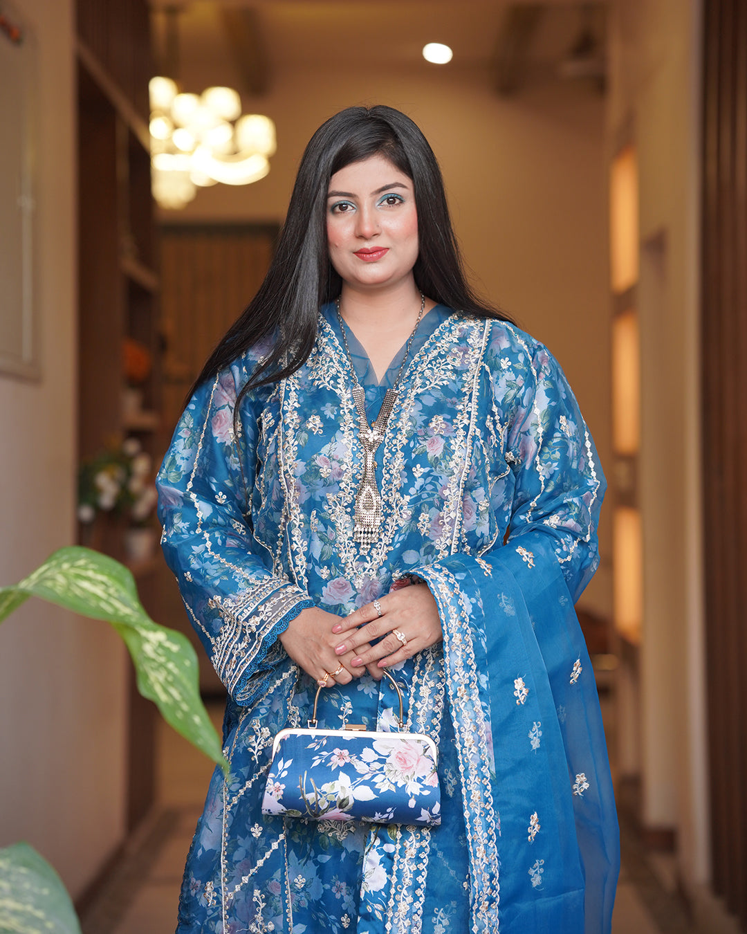 A stunning 3 piece outfit featuring a long flowing luxury embroidered organza kameez in a rich blue shade. The suit is completed with matching dyed trousers, luxury hand clutch and a sheer embroidered organza dupatta with a decorative border, offering a sophisticated and festive look. Perfect for formal occasions, weddings, or celebratory events.